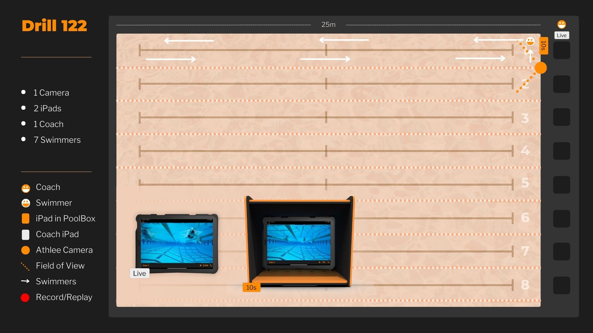 The swimmer in lane 1 moves toward the camera along the lane rope before sliding out to the side. The swimmer’s iPad is positioned in the pool box and runs on a 10-second delay. The coach’s iPad streams live from the same camera, allowing the coach to see the action 10 seconds before the swimmer does. This enables the coach to point out what the swimmer should be looking at when the delayed video appears on the swimmer’s iPad.